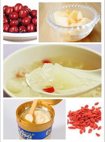 首先我们要准备好必要的材料:银耳、黑木耳、枸杞、大枣、梨,纯天然不加人工干预的最好。前一晚就将银耳、黑木耳冷水泡发,枸杞大枣洗净,梨切成一小片一小片的备用。因为大枣比较不容易煮烂,所以先把大枣放进锅里煮半个小时,之后放入其他食材,大火炖,开锅后,改成小火,慢炖至银耳及黑木耳软烂就可以了。